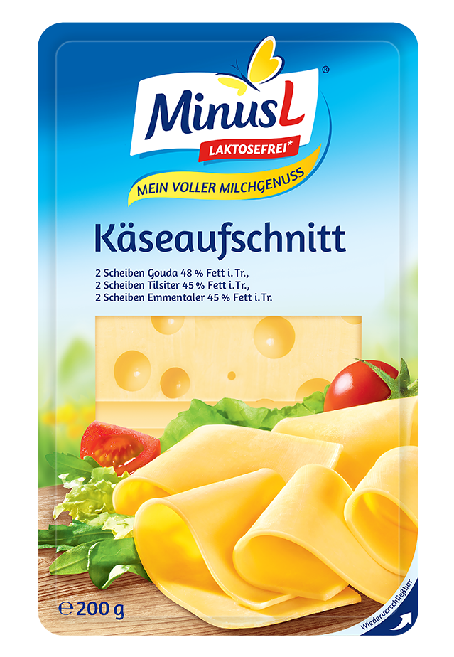 Genussvielfalt für Käseliebhaber: Der MinusL Käseaufschnitt bietet Gouda, Tilsiter und Emmentaler – von mild-aromatisch bis pikant-nussig. Natürlich laktosefrei.